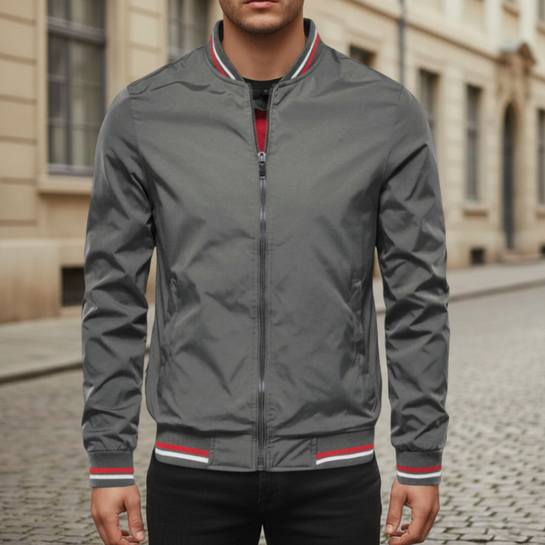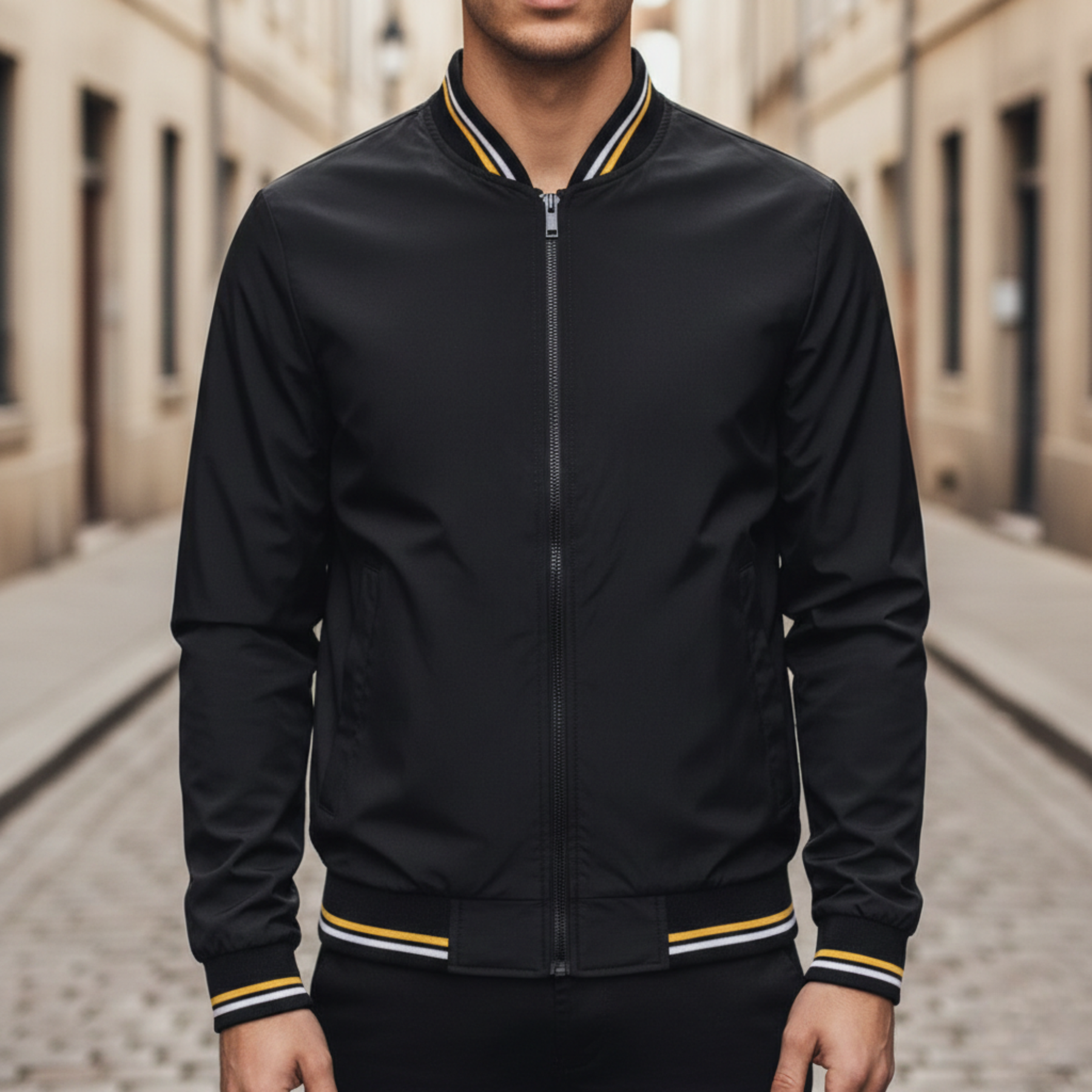 This men’s bomber jacket features a zip front closure with a ribbed collar, cuffs, and hem. Designed with a lightweight construction, it is suitable for autumn and transitional weather. The structured silhouette includes side pockets and a clean solid color finish for casual and smart casual wear. Intended for adult men seeking a versatile jacket for everyday use.