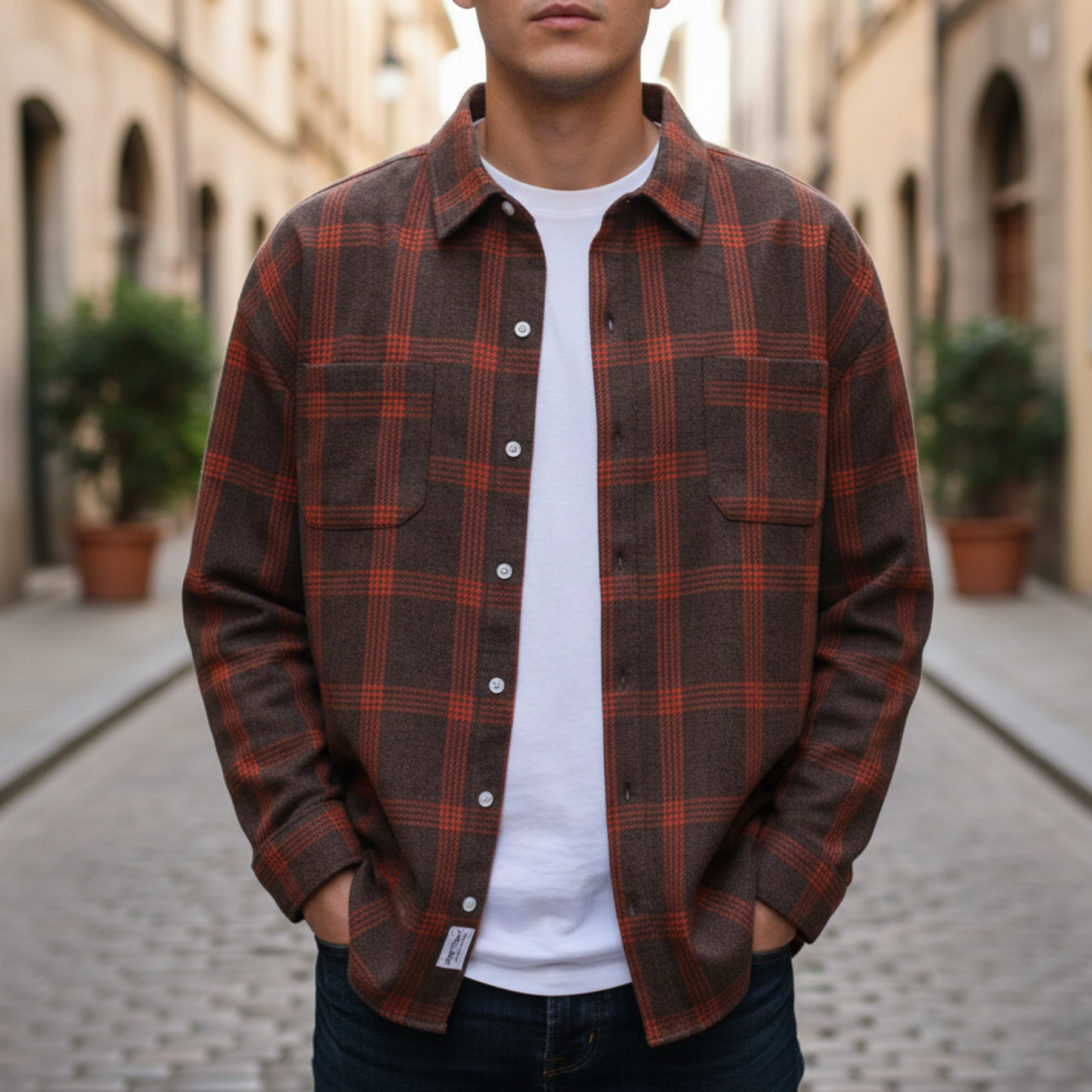 This men’s flannel shirt is designed for adult wear and features a long sleeve cut with a classic collar and full button front closure. The shirt has a checkered pattern in brown and orange tones and is intended for casual and everyday use. It can be worn as a standalone top or layered over a T shirt in cooler conditions, making it suitable for relaxed settings and transitional seasons where a casual flannel style is preferred.