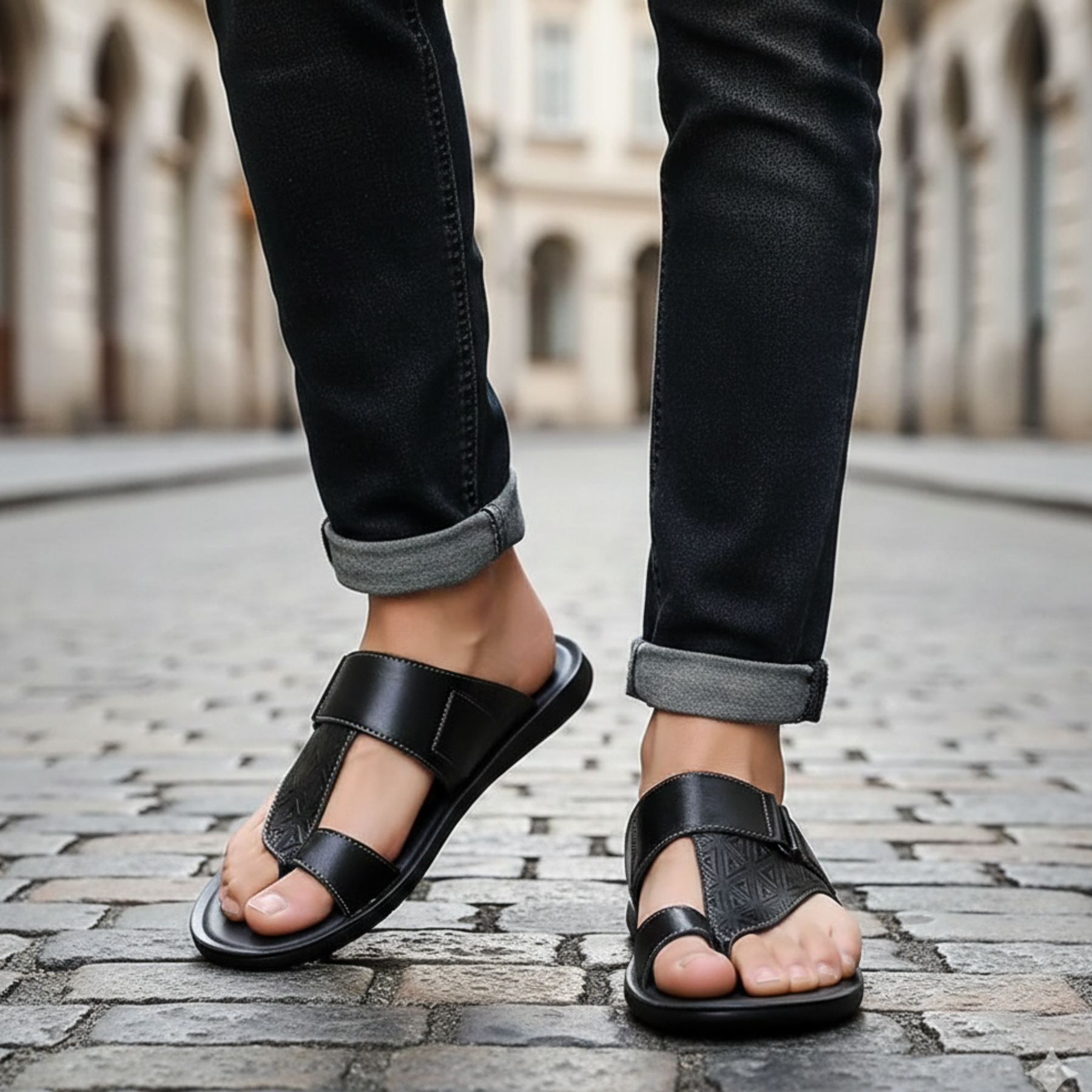 These men’s leather sandals feature an open toe design with wide crossover straps and a slip on style. The flat sole and lightweight construction make them suitable for summer wear and casual use. Designed for adult men, they can be paired with shorts or lightweight trousers for everyday outings and warm weather occasions.