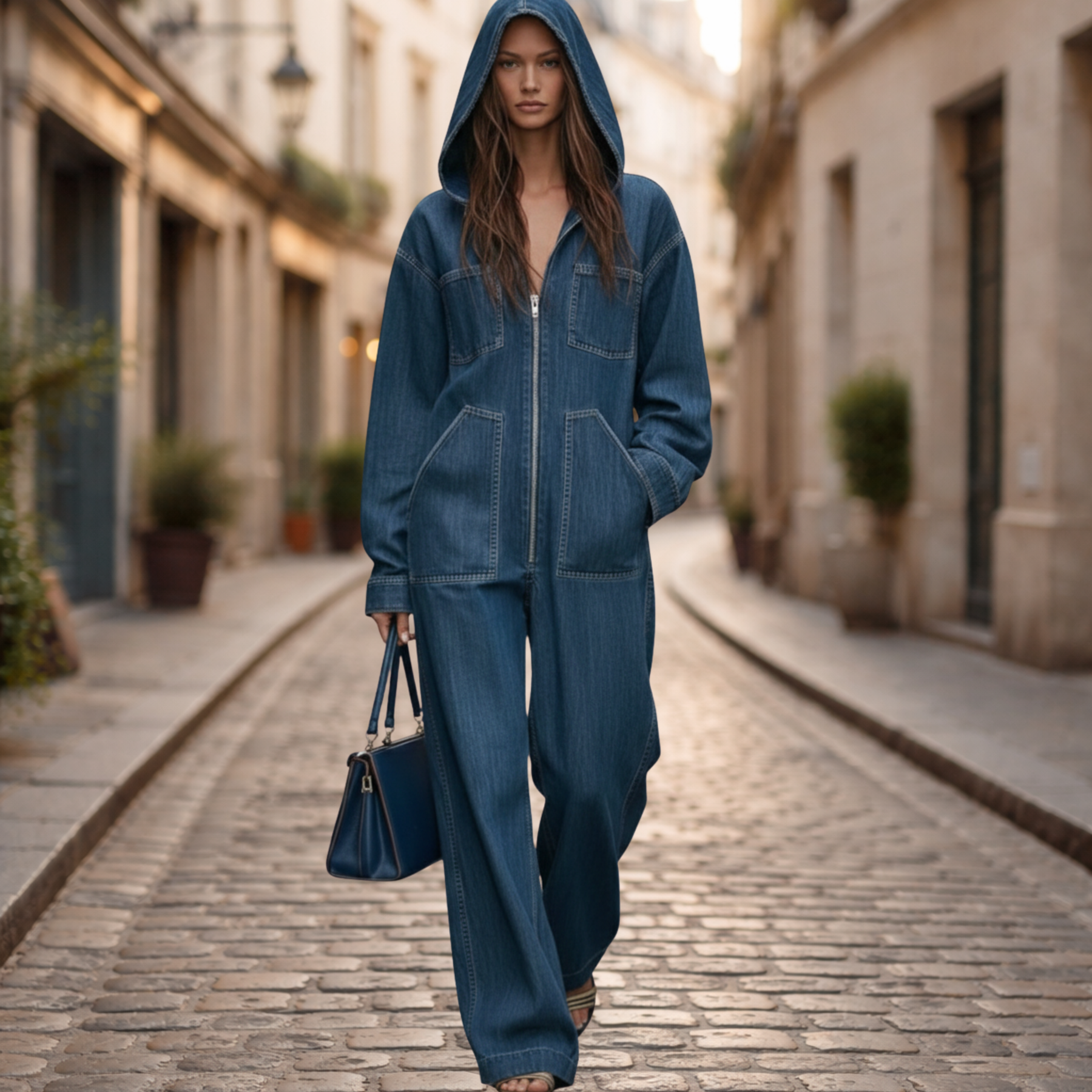 Casual denim jumpsuit for women designed with a hood, long sleeves, and zipper front closure. This garment is worn as everyday clothing and includes loose fit construction, pocket details, full length leg form, and durable woven denim structure suitable for routine seasonal use.