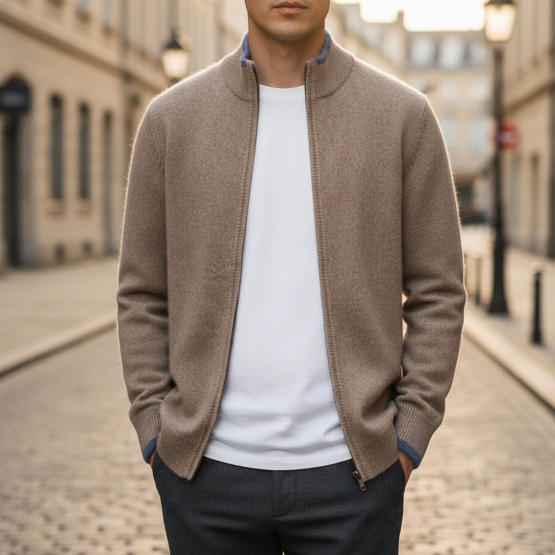 Este suéter de cachemira para hombres cuenta con un cierre frontal de cremallera completa con un cuello alzado y mangas largas. Diseñado con puños y dobladillo acanalados, ofrece un ajuste regular adecuado para superponerse a camisetas o camisas. Los colores neutros sólidos lo hacen apropiado para vestimenta casual y smart casual durante las temporadas más frescas.